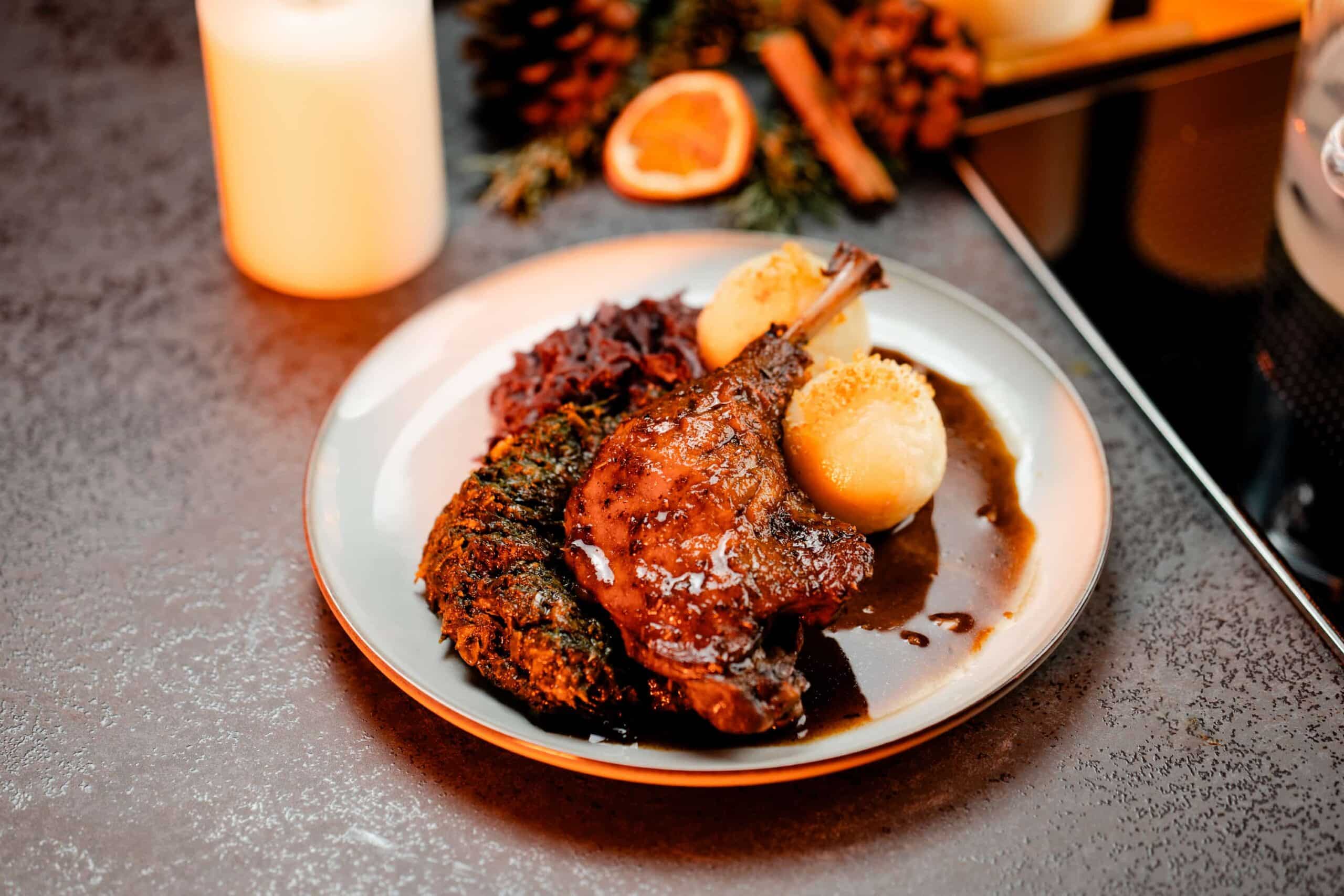 Die Boxen sind für zwei Personen konzipiert und enthalten wahlweise eine Entenkeule oder eine vegane Keule als Hauptgang. Dazu gehören eine Süßkartoffel-Kürbissuppe, Rotkohl, Grünkohl, Kartoffelklöße und Schokoladenbrownies mit Orangen-Toffee.